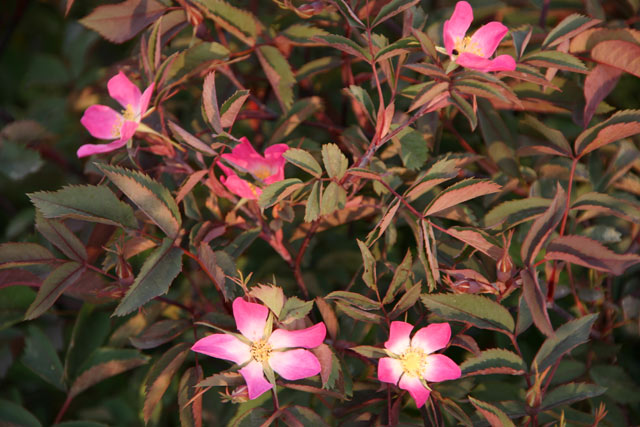 - Rosa gymnocarpa, Little Woods Rose, Herkunft: Nordamerika 1893 Wildrose, rosa, kein Duft, einmalblühend, Herbstfärbung des Laubes, kleine glatte, birnenförmige, rote Hagebutten
